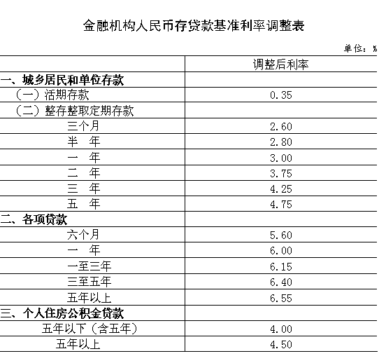 中廣網(wǎng)北京7月5日消息 據(jù)中國(guó)人民銀行網(wǎng)站信息,中國(guó)人民銀行決定,自2012年7月6日起下調(diào)金融機(jī)構(gòu)人民幣存貸款基準(zhǔn)利率。金融機(jī)構(gòu)一年期存款基準(zhǔn)利率下調(diào)0.25個(gè)百分點(diǎn),一年期貸款基準(zhǔn)利率下調(diào)0.31個(gè)百分點(diǎn);其他各檔次存貸款基準(zhǔn)利率及個(gè)人住房公積金存貸款利率相應(yīng)調(diào)整。