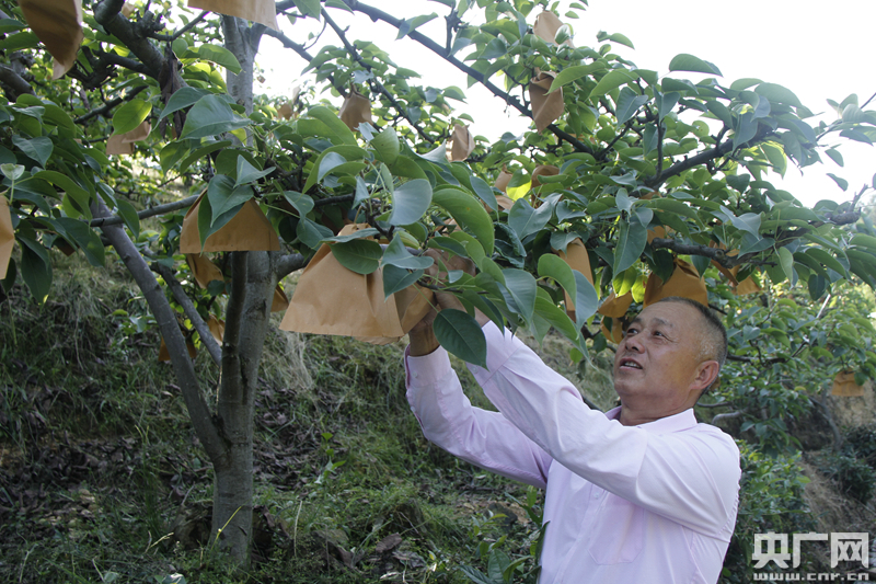 彭飛在果園檢查梨子的生長情況(張兆福 攝)