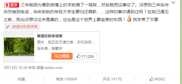 他的故事肇始于一個微博博主的長文,在今天以#不曾遺忘的承諾#的關(guān)鍵詞被刷上微博熱搜榜,數(shù)據(jù)顯示閱讀量超過1800萬。