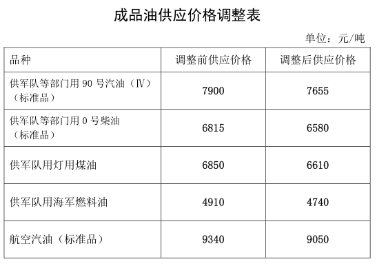 一、成品油生產(chǎn)經(jīng)營(yíng)企業(yè)供軍隊(duì)及新疆生產(chǎn)建設(shè)兵團(tuán)、國家儲(chǔ)備用汽、柴油(標(biāo)準(zhǔn)品,下同)供應(yīng)價(jià)格每噸分別降低245元和235元,調(diào)整后的汽、柴油供應(yīng)價(jià)格分別為每噸7655和6580元。其他成品油價(jià)格相應(yīng)調(diào)整。調(diào)整后的成品油標(biāo)準(zhǔn)品價(jià)格見附件1。
