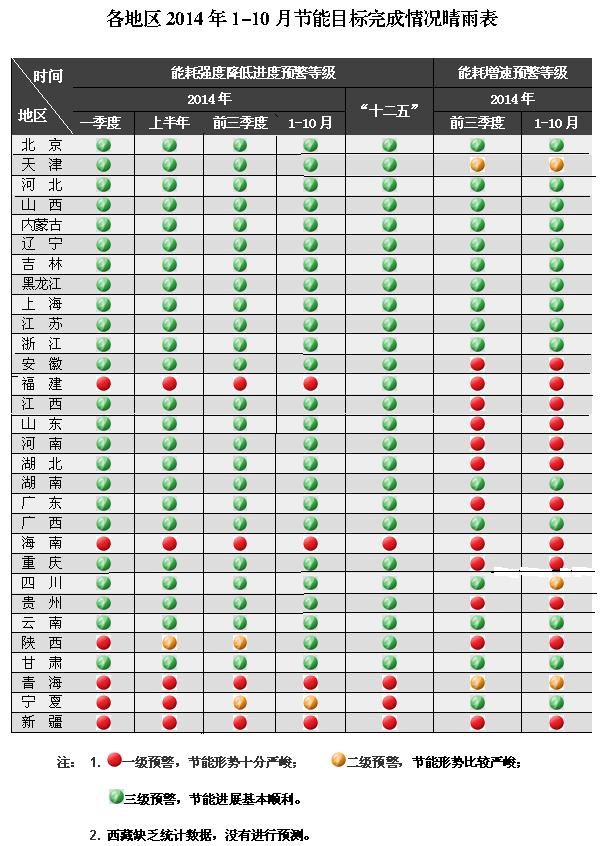 央廣網(wǎng)北京12月3日消息 近日,國家發(fā)布了各地區(qū)2014年1-10月節(jié)能目標(biāo)完成情況晴雨表。通過對各地區(qū)節(jié)能形勢進(jìn)行分析,對照各地“十二五”年均節(jié)能任務(wù),1-10月,福建、海南、青海、新疆等4個(gè)地區(qū)預(yù)警等級為一級,節(jié)能形勢十分嚴(yán)峻;寧夏地區(qū)預(yù)警等級為二級,節(jié)能形勢比較嚴(yán)峻;北京、天津、河北、山西、內(nèi)蒙古、遼寧、吉林、黑龍江、上海、江蘇、浙江、安徽、江西、山東、河南、湖北、湖南、廣東、廣西、重慶、四川、貴州、云南、陜西、甘肅等25個(gè)地區(qū)預(yù)警等級為三級,節(jié)能工作進(jìn)展基本順利。與前三季度相比,陜西由二級預(yù)警下降為三級預(yù)警。西藏缺乏統(tǒng)計(jì)數(shù)據(jù),沒有進(jìn)行預(yù)測。