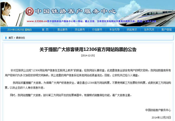 隨后,針對(duì)互聯(lián)網(wǎng)上出現(xiàn)“12306網(wǎng)站用戶信息在互聯(lián)網(wǎng)上瘋傳”的報(bào)道,12306官方網(wǎng)站發(fā)布聲明公告,稱經(jīng)認(rèn)真核查,此泄露信息全部含有用戶的明文密碼。12306網(wǎng)站數(shù)據(jù)庫(kù)所有用戶密碼均為多次加密的非明文轉(zhuǎn)換碼,網(wǎng)上泄露的用戶信息系經(jīng)其他網(wǎng)站或渠道流出。目前,公安機(jī)關(guān)已經(jīng)介入調(diào)查。