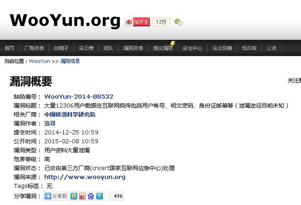 據(jù)名為“追尋”的白帽子披露,大量12306用戶數(shù)據(jù)在互聯(lián)網(wǎng)瘋傳,包括用戶賬號(hào)、明文密碼、身份證、郵箱等,泄露途徑目前未知。此漏洞類型為“用戶資料大量泄露”,危害等級(jí)為“高”!白穼ぁ痹谠撀┒吹拿枋鲋斜硎,數(shù)據(jù)只是在傳播售賣,無(wú)法確認(rèn)是12306官方還是第三方搶票平臺(tái)泄露。