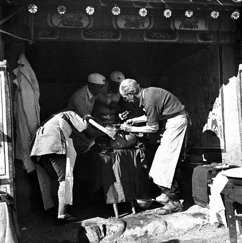 1938年6月,白求恩從延安來到晉察冀,見到聶榮臻的第一句話就是:“告訴我,司令員同志,我的戰(zhàn)斗崗位在哪里?”同志們勸他休息一會,他說:“我是來工作的,不是來休息的。你們不要把我當成古董,要把我當成一挺機關槍使用!”第二天,他就奔赴60多里外的五臺縣松巖口村后方醫(yī)院,并立即投入工作。一個星期,白求恩就診治了521名傷員,前一個月就為157名傷員做了手術。在異常艱苦條件下,對于年近半百僅有一個肺葉機能的白求恩來說,平均每天做5臺手術,令人難以置信。