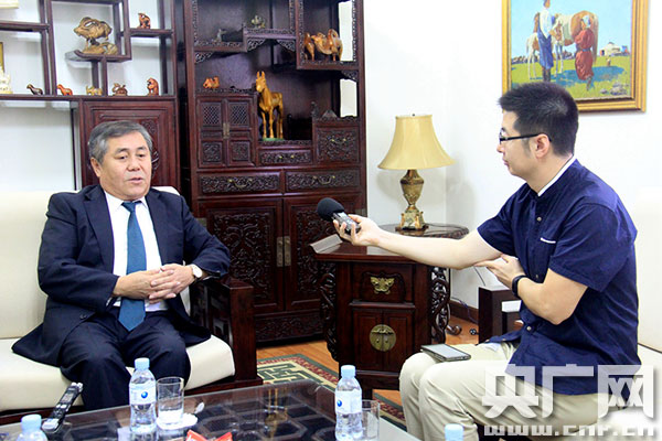 蒙古國(guó)駐華大使蘇赫巴特爾正在接受中央人民廣播電臺(tái)記者專(zhuān)訪