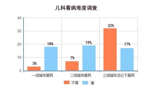在孩子看病難不難這個(gè)問題上,過半被調(diào)查者認(rèn)為看病難。但這個(gè)問題在不同級(jí)別的城市之間也有著顯著區(qū)別,一、二線城市選擇看病難的比例遠(yuǎn)遠(yuǎn)高于不難,但是在三線城市里,認(rèn)為不難的網(wǎng)友更多。