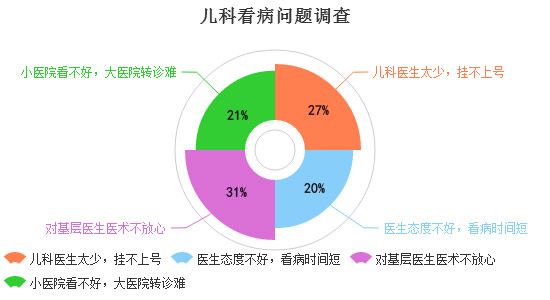 常理上說,兒科醫(yī)生緊缺,是人們覺得兒科看病難的直接原因。但在調(diào)查數(shù)據(jù)中,卻有31%的被調(diào)查者認(rèn)為主要問題是“對(duì)基層醫(yī)生醫(yī)術(shù)不放心”,剩下27%的人認(rèn)為兒科醫(yī)生緊缺。