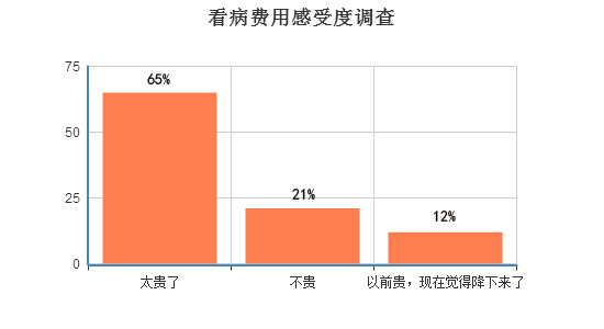 在看病貴這個(gè)老問題上,仍然有65%的被調(diào)查者認(rèn)為太貴了,但是有12%的被調(diào)查者對(duì)醫(yī)療改革點(diǎn)了贊,認(rèn)為現(xiàn)在降下來了。