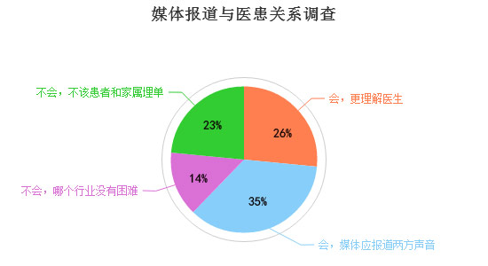 在醫(yī)患關(guān)系這個(gè)問題上,媒體責(zé)任重大。過半(61%)被調(diào)查者認(rèn)為通過媒體的報(bào)道可以緩解醫(yī)患關(guān)系,而且35%的被調(diào)查者認(rèn)為媒體應(yīng)該更多的報(bào)道兩方面的聲音。這對(duì)媒體報(bào)道涉醫(yī)領(lǐng)域應(yīng)該是一個(gè)啟發(fā)。