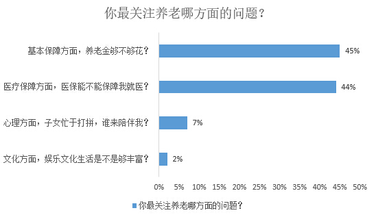 隨著年齡的增加,醫(yī)療需求將變成老年人的剛性需求,而現(xiàn)在 “看病貴、看病難、甚至一病返貧”的現(xiàn)象依然存在,這讓不少被調(diào)查者(44%)更關(guān)心現(xiàn)有的醫(yī)保政策能否充分保障自己的老年就醫(yī)問題。