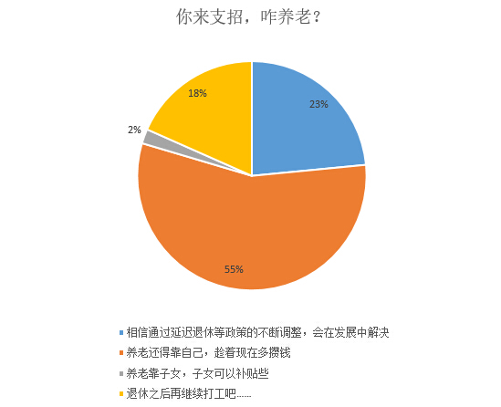 18%的被調(diào)查者表示,自己既不相信政策調(diào)整能解決養(yǎng)老問題,也不敢保證能趁著年輕能夠攢到足夠養(yǎng)老的錢,更不想麻煩子女,唯一的出路就是退休了接著去打工賺錢……
