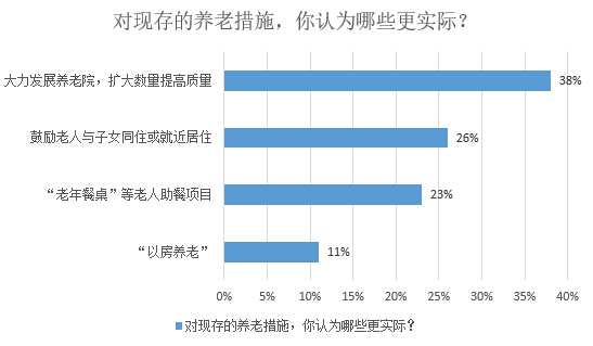 在被問及“對現(xiàn)存的養(yǎng)老措施,你認為哪個更實際”這個問題時,絕大部分被調(diào)查者(38%)認為還是大力發(fā)展養(yǎng)老院,增加養(yǎng)老院的數(shù)量,并提高養(yǎng)老院的服務(wù)質(zhì)量更為實際!肮膭罾先伺c子女同住或就近居住”成為了被選擇第二多的選項(26%)。雖然在本次問卷中,極少數(shù)的被調(diào)查者表示會依靠子女來養(yǎng)老,但是,大家顯然認為,和子女同住或就近居住,方便互相照料是個較為實際的養(yǎng)老選擇。還有23%的被調(diào)查者認為,大力發(fā)展“老年餐桌”等老年助餐項目也不失為一個好措施。