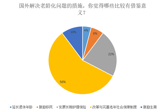 56%的被調(diào)查者認為,解決老齡化問題,最具有借鑒意義的措施應(yīng)該是“改革與完善老年社會保障制度”。還有22%的被調(diào)查者贊同樓部長的建議,認為發(fā)展“長期養(yǎng)老護理險”是解決“養(yǎng)老難”難題的有效措施之一,值得借鑒。