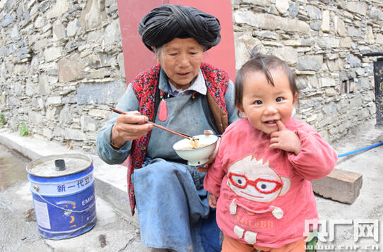 9月12日下午,網(wǎng)媒記者團來到小金縣實地采訪。剛進村,記者看到一位老奶奶在喂小朋友吃飯,通過交流,記者了解到,這位老人今年67歲,小朋友是她的重孫!耙郧白≡谕翂Ψ,汶川地震房子塌了,現(xiàn)在住在政府修建的磚瓦房,日子比以前好多了”,老奶奶一邊逗著重孫女吃飯,一邊對記者說。