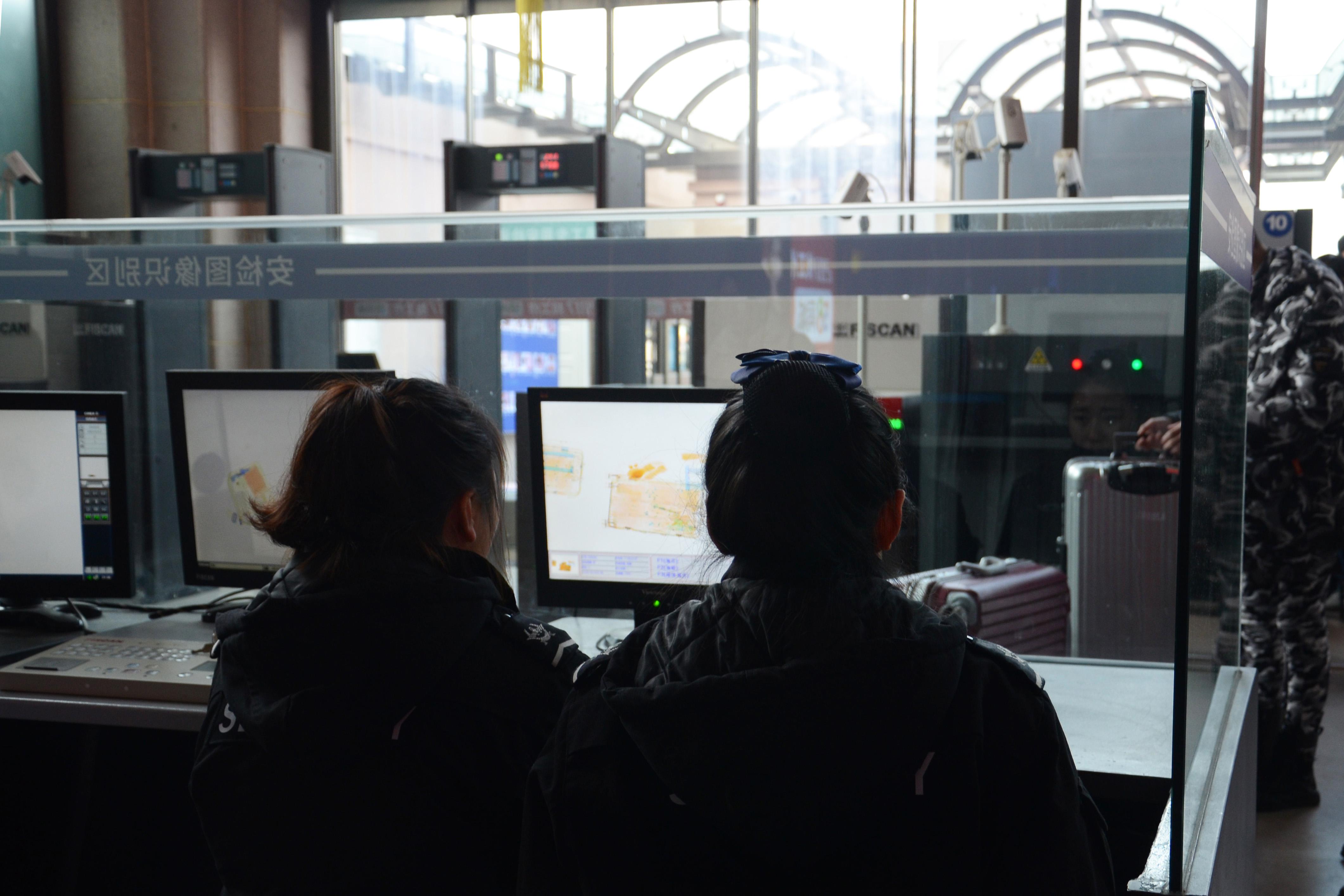 安檢工作人員正在通過電腦圖像識別乘客是否攜帶違禁物品。(央廣網(wǎng)記者 范姜國一/攝)