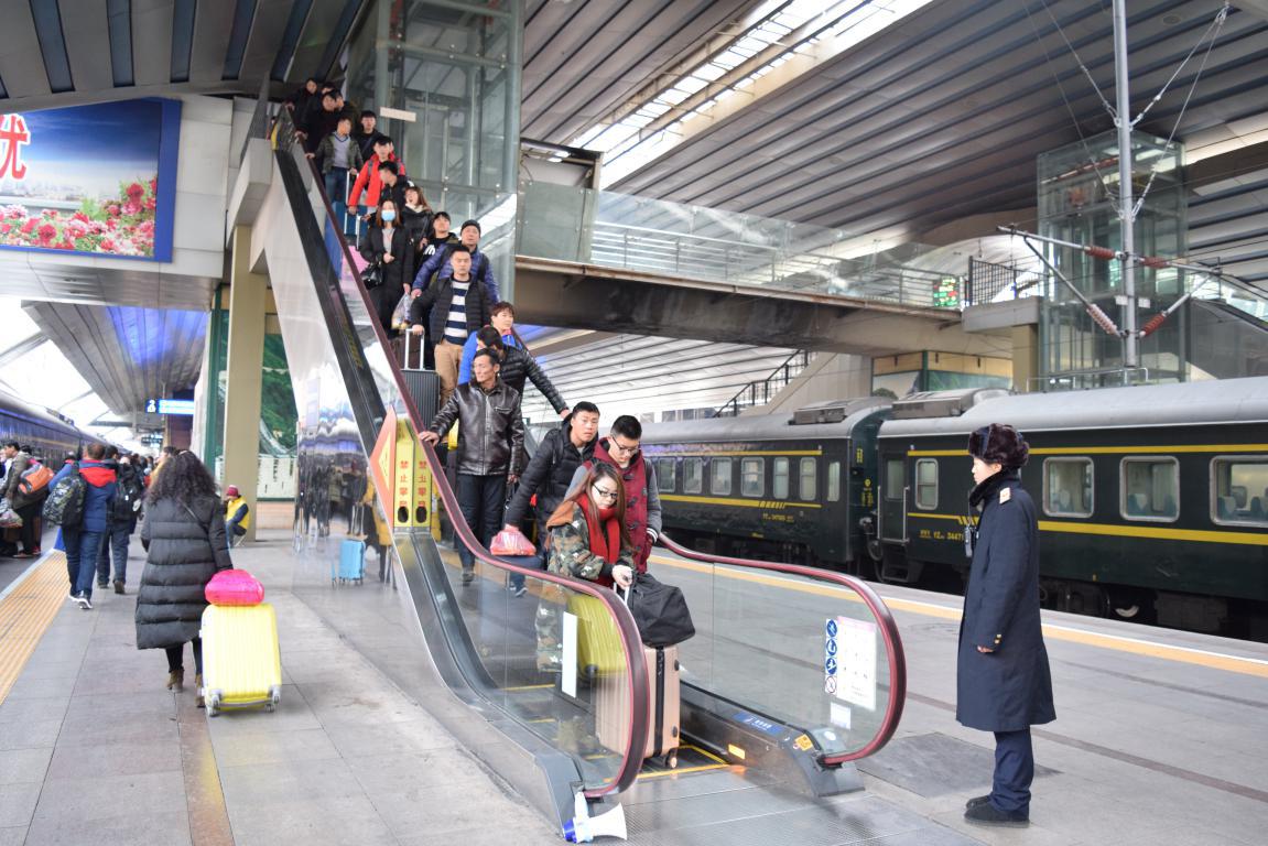 由于春運客流量大、旅客攜帶行李多,檢票進站臺時存在諸多安全隱患。為確保旅客有序進入站臺、安全登上列車,北京站在每個站臺設置了兩名站臺客運員,負責緊急疏導、站臺巡視等安全事項。