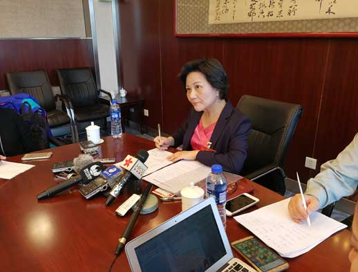 陳云英認真傾聽記者問題,不時記錄