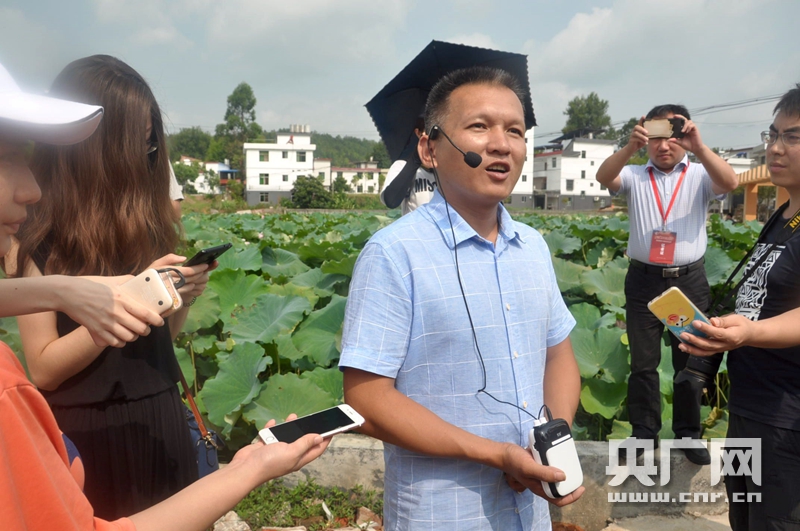 圖為楊運華向采訪團記者介紹荷花種植情況 央廣網記者王子衿攝
