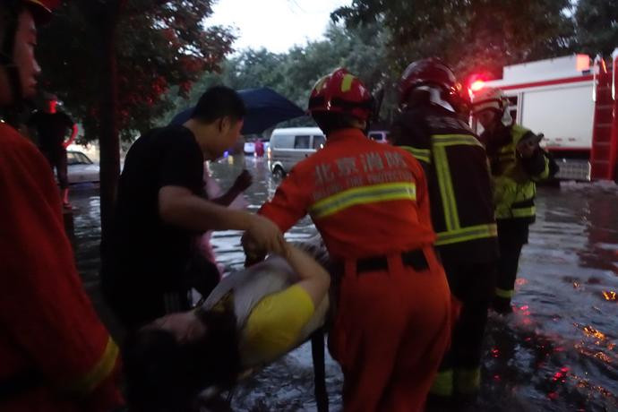 暴雨突襲,北京消防用擔(dān)架將受困孕婦移至安全區(qū)