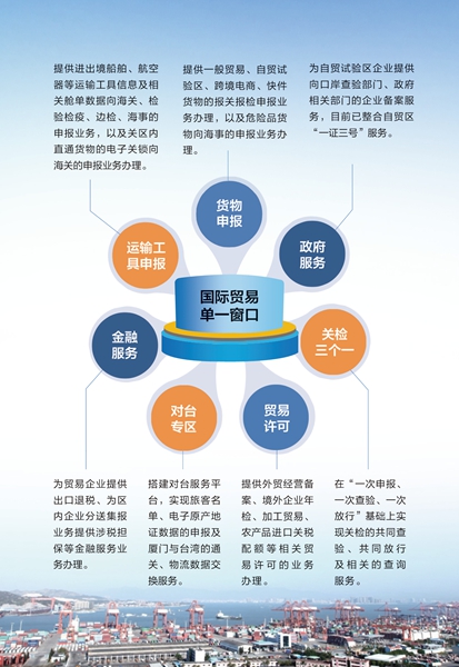 廈門國際貿易“單一窗口”是由36個部門共同建設和運營的口岸管理共享平臺,2015年4月21日,平臺正式上線,集貨物申報、關檢“三個一”、運輸工具申報等七大功能于一身,使船舶進出口岸、跨境電商、一般貨物報關等口岸核心業(yè)務均實現(xiàn)“一個窗口、一次申報、一次辦結”。