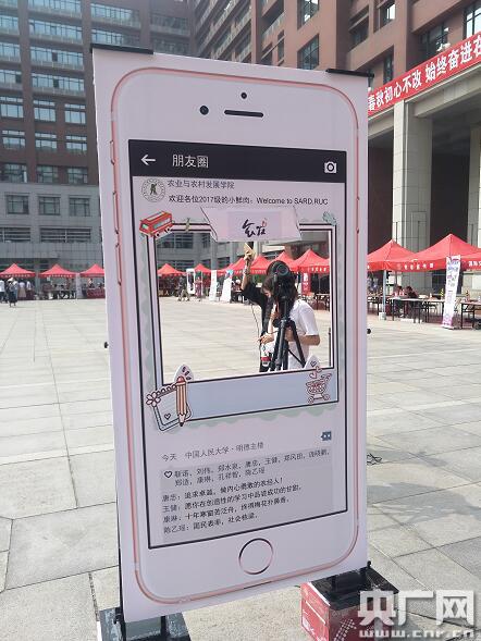 今天下午,記者在人大明德廣場迎新現(xiàn)場看到,很多學院為了歡迎師弟師妹們,親手制作了新穎的迎新海報,各學院擺設模擬朋友圈,給新生及家長們留下萌照和入學紀念。比如,農(nóng)業(yè)與農(nóng)村發(fā)展學院為新生準備了“報到朋友圈”,還配上“歡迎2017級小鮮肉”的網(wǎng)絡流行語,“朋友圈”評論區(qū)下面還配有學校院長、書記的點贊,并附帶上“追求卓越、做內(nèi)心勇敢的農(nóng)經(jīng)人”“十年寒窗苦泛舟,終得梅花撲鼻香”等對新生的寄語。