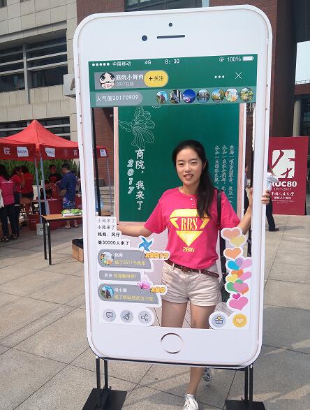 除了為新生制作“朋友圈”,人大商學院的師兄師姐還將留影的牌子制作成時下流行的直播間,“直播間”上的人氣值即是新生報到的日期,好玩的設計,惹得一些00后新生還未走完報到程序就紛紛跑來拍照。
