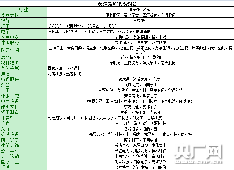 該藍皮書根據(jù)各行業(yè)上市公司價值評估綜合排名,并參考各行業(yè)上市公司數(shù)量選取每個行業(yè)排名前5%的公司,選出最能代表本行業(yè)未來發(fā)展方向和盈利驅(qū)動的上市公司,構(gòu)成漂亮100投資組合。