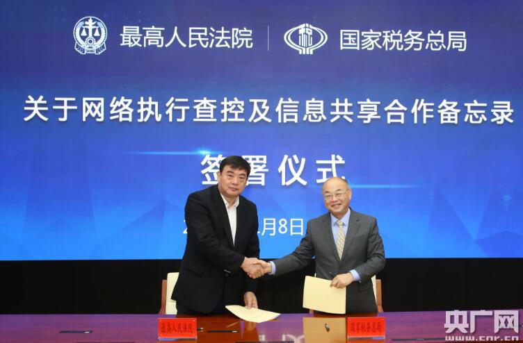 央廣網(wǎng)北京11月8日消息(記者高藝寧)8日上午,最高人民法院和國(guó)家稅務(wù)總局簽署了《關(guān)于網(wǎng)絡(luò)執(zhí)行查控及信息共享合作備忘錄》(以下簡(jiǎn)稱(chēng)《備忘錄》),最高人民法院審判委員會(huì)專(zhuān)職委員劉貴祥出席簽約活動(dòng)并講話(huà)。他強(qiáng)調(diào),要進(jìn)一步拓展對(duì)被執(zhí)行人財(cái)產(chǎn)的查控手段和措施,加大對(duì)失信被執(zhí)行人的聯(lián)合懲戒力度,構(gòu)建以誠(chéng)信為核心的多維監(jiān)管體系,加大各領(lǐng)域懲戒力度,堅(jiān)決打贏基本解決執(zhí)行難這場(chǎng)硬仗。