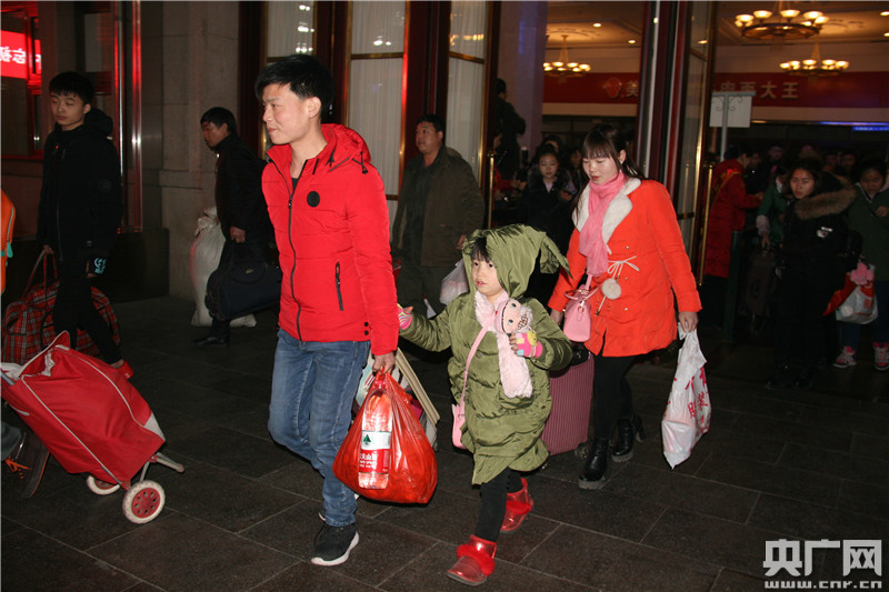 “北京--重慶北站3603次,開始檢票!”零點(diǎn)剛過,隨著工作人員的一聲提示,在閘機(jī)旁值守的工作人員打開柵欄,拖著行李的旅客紛紛涌向進(jìn)站口,在人與人的擁擠中,回石家莊老家過年的王先恩剛剛和妻子發(fā)完一條報(bào)平安的簡(jiǎn)短微信,聽到檢票提醒,他抓起倆個(gè)大行李箱、拉上今年9歲的小兒子就往外沖。