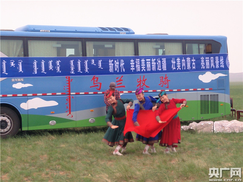 在內蒙古自治區(qū)錫林浩特市寶力根蘇木勝利嘎查的草地上,一輛印有“烏蘭牧騎”字樣的藍色大巴車緩緩停下,身著蒙古族服飾的老中青隊員們接連下車,忙著擺置板凳桌椅、換裝上妝、現場試音......草地即是舞臺,藍天就是幕布,一場演出馬上開始。