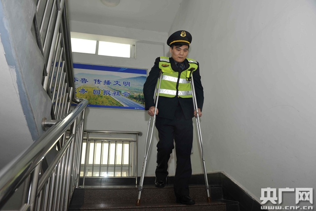 但沒人注意到,就在崔凱的右手旁還立著一雙拐杖。如果日子一如往常,崔凱會(huì)準(zhǔn)時(shí)出現(xiàn)在收費(fèi)口,但每走一步都要依靠雙拐支撐。