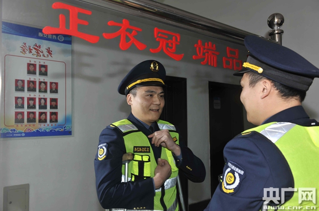 車輛通行卡、服務(wù)監(jiān)督牌、鈔票夾、報(bào)驗(yàn)單、相機(jī)……收費(fèi)員上崗前檢查票箱查驗(yàn)收費(fèi)用品是否齊全。崔凱上崗前正在整理著裝。