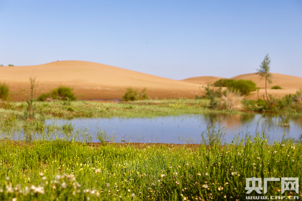 引入黃河水后,庫布其沙漠腹地水草豐茂(攝于7月24日)。(央廣網(wǎng)記者 張凱航 攝)