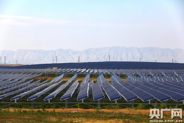 2萬畝沙地上支起的60萬塊光伏發(fā)電板,年均發(fā)電量達5億度,銷售收入約4.5億元(攝于7月22日)。(央廣網(wǎng)記者張凱航 攝)
