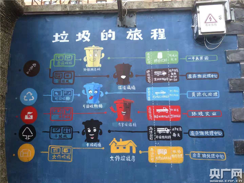 中華別墅小區(qū)垃圾庫房墻上,居委會請第三方機(jī)構(gòu)繪制了垃圾循環(huán)流程、每天分批清運(yùn)的時間。(央廣網(wǎng)記者 王晶 攝)