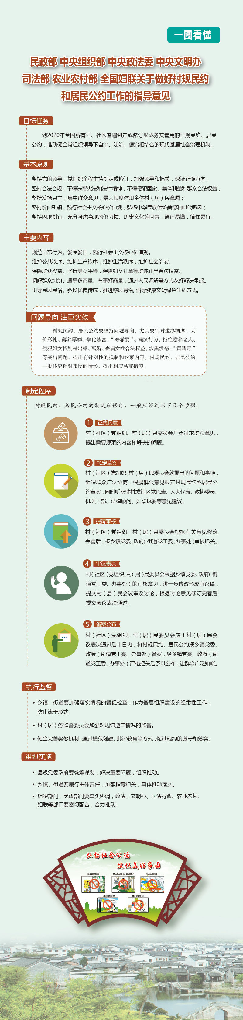 新出臺(tái)的《指導(dǎo)意見》從總體要求、主要內(nèi)容、制定程序、監(jiān)督落實(shí)和組織領(lǐng)導(dǎo)等五個(gè)方面對(duì)村規(guī)民約和居民公約工作提出規(guī)范要求,并提出“到2020年全國(guó)所有村、社區(qū)普遍制定或修訂形成務(wù)實(shí)管用的村規(guī)民約、居民公約,推動(dòng)健全黨組織領(lǐng)導(dǎo)下自治、法治、德治相結(jié)合的現(xiàn)代基層社會(huì)治理機(jī)制”的工作目標(biāo)。民政部相關(guān)負(fù)責(zé)人表示這將對(duì)充分發(fā)揮村規(guī)民約和居民公約積極作用,推動(dòng)形成多維度依法治理,不斷提升城鄉(xiāng)社區(qū)治理能力和治理水平具有重要意義。