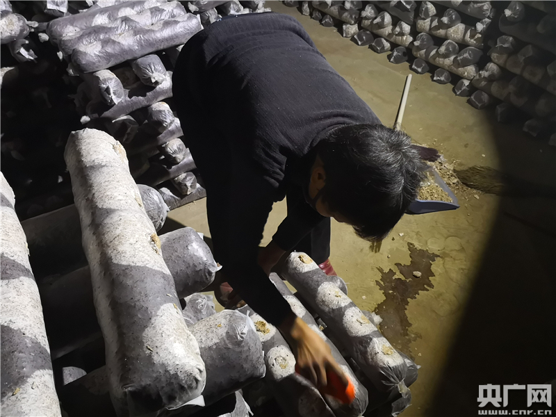 保溫棚內(nèi),工人們正在給菌棒澆水、打孔透氣。(央廣網(wǎng)記者 劉一荻 攝)