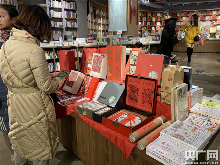 2月8日,正月初四,青島方所書店內(nèi),顧客正在欣賞以春節(jié)為主題的年畫周邊產(chǎn)品。(央廣網(wǎng)記者 孫冰潔 攝)