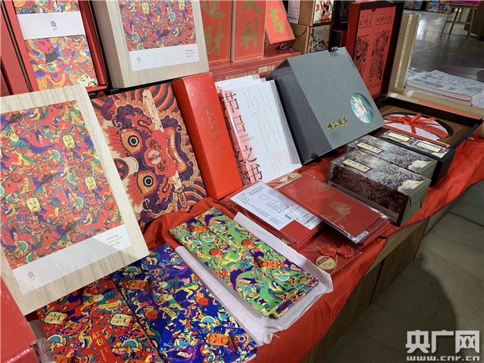 除年畫外,現(xiàn)場還展出了不少以年畫為靈感來源的周邊文創(chuàng)產(chǎn)品:印有門神頭像的紅包、手賬、書簽以及行李牌等。(央廣網(wǎng)記者 孫冰潔 攝)