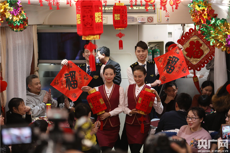 央廣網(wǎng)北京2月19日消息(記者王晶 張凱航)今天是中國(guó)傳統(tǒng)佳節(jié)元宵節(jié),春運(yùn)鐵路也迎來(lái)了返程高峰。猜燈謎、吃湯圓、看歌舞……昨晚(18日),北京開往山城重慶的Z3次列車餐車張燈結(jié)彩,車上的旅客驚喜地發(fā)現(xiàn)自己趕上了由中國(guó)鐵路北京局集團(tuán)公司北京客運(yùn)段“傳承”文藝小分隊(duì)帶來(lái)的一臺(tái)熱鬧的文藝晚會(huì),提前過(guò)了個(gè)歡歡喜喜的元宵節(jié)。