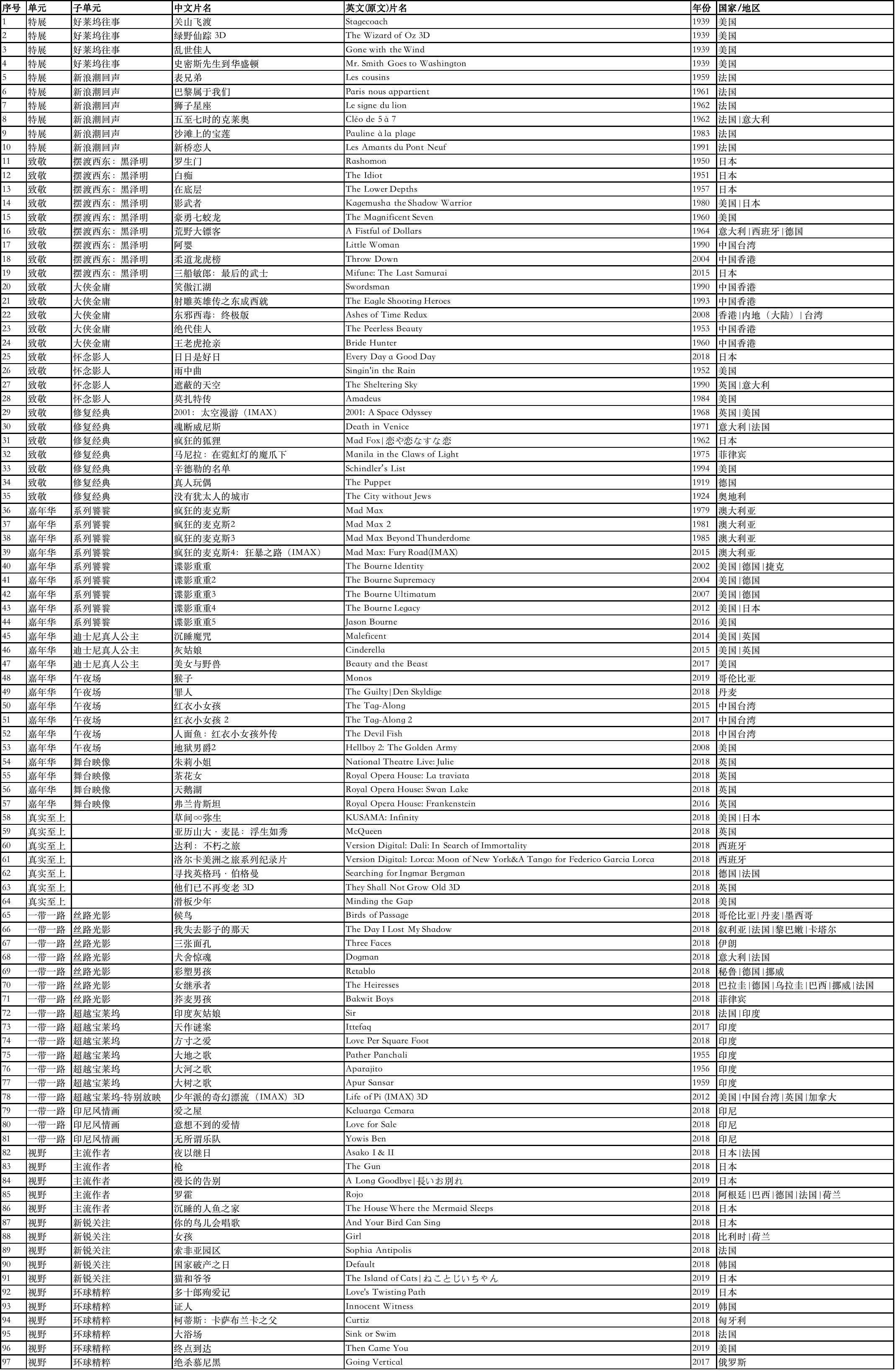 “特展–1939 1959 2019:光影奇遇”立足1959年向前后延展目光,用“好萊塢往事”、“新浪潮回聲”、“華時代風(fēng)景”三個子單元,追憶電影史上的偉大作者,展現(xiàn)中國電影文化主體的不懈努力!敖裹c”單元力邀多位世界重量級導(dǎo)演,包括但不限于黑澤明、阿方索·卡隆、蔡明亮、張律的專題放映和特別策劃,為眾多影迷提供一次豐富多彩的光影盛宴。此外,北京展映還匯聚了一年來在各個國際電影節(jié)中斬獲大獎、備受好評的影像佳作,以“一帶一路”為串聯(lián),對沿線國家的優(yōu)秀電影作品拾遺補缺。除此之外,本次展映還有“中國故事”、“視野”、“真實至上”等多個版塊,力圖為更多不同年齡段、不同觀影口味的人們提供光影體驗。
