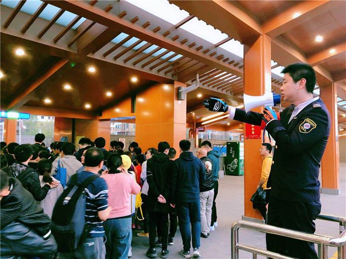 清明小長假,工作人員協(xié)助乘客進站。(北京公交集團供圖)