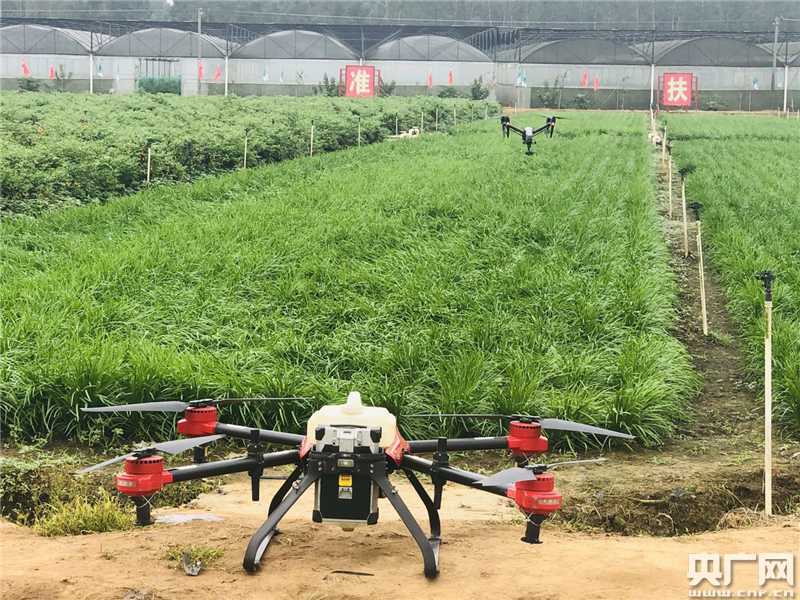 中化農(nóng)業(yè)雷州MAP示范園的無(wú)人機(jī)進(jìn)行植保作業(yè)。(央廣網(wǎng)記者 高藝寧 攝)