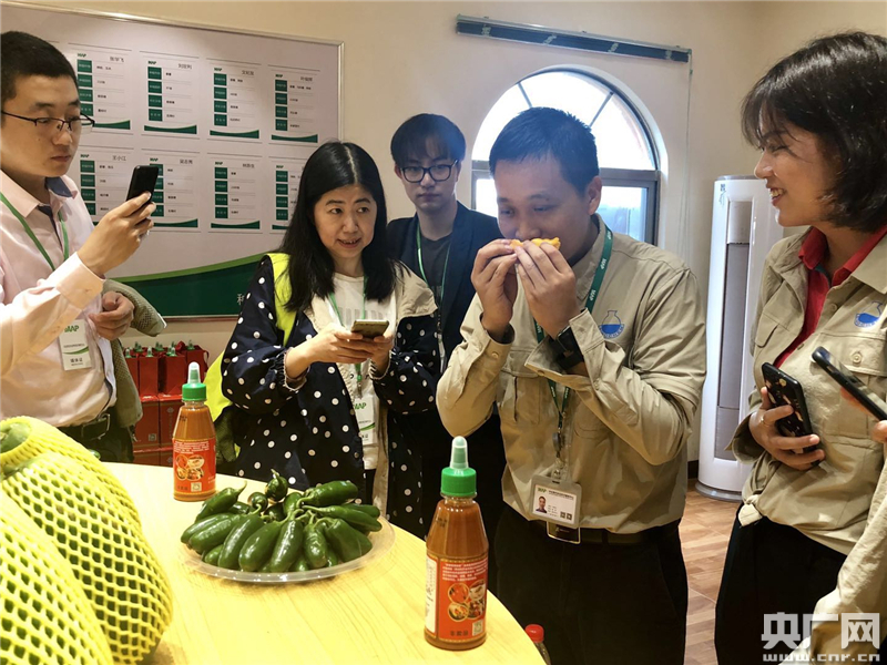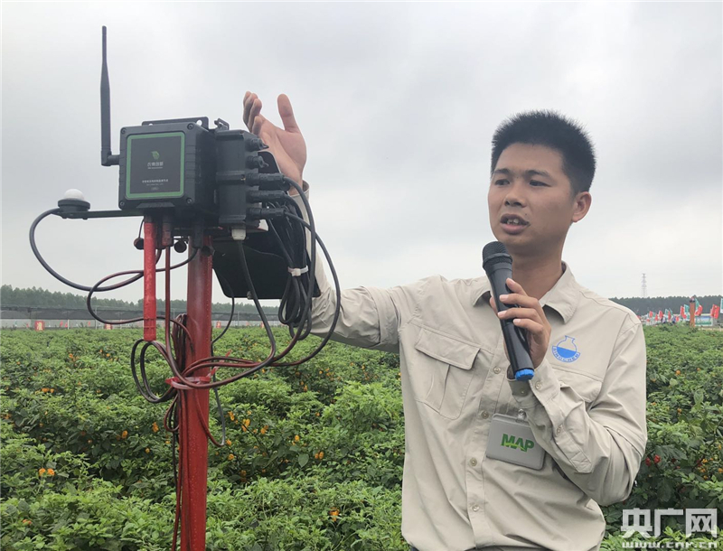 作物經(jīng)理常燦賢介紹土壤墑情儀等智慧農(nóng)業(yè)設(shè)備。(央廣網(wǎng)記者 高藝寧 攝)