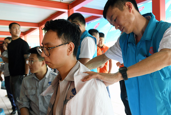 志愿者正在為冬奧會(huì)建設(shè)者做肩頸按摩(央廣網(wǎng)發(fā) 北京市總工會(huì)供圖)