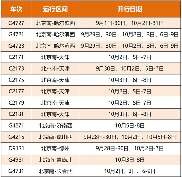 北京南站增開旅客列車14列。詳情如下圖: