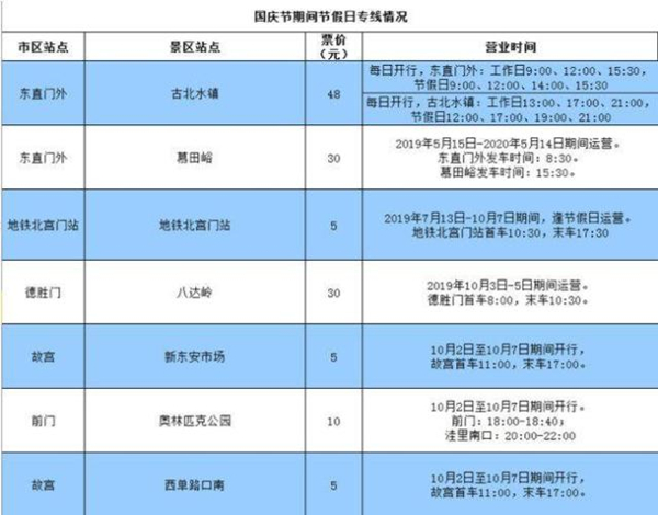 在假日專線方面,由東直門出發(fā),分別往返古北水鎮(zhèn)、慕田峪長城,德勝門往返八達嶺長城,前門往返奧林匹克公園,地鐵北宮門至頤和園,以及故宮往返新東安市場、西單,線路一站直達,票價從10元至48元不等,持各類免票證件無效。