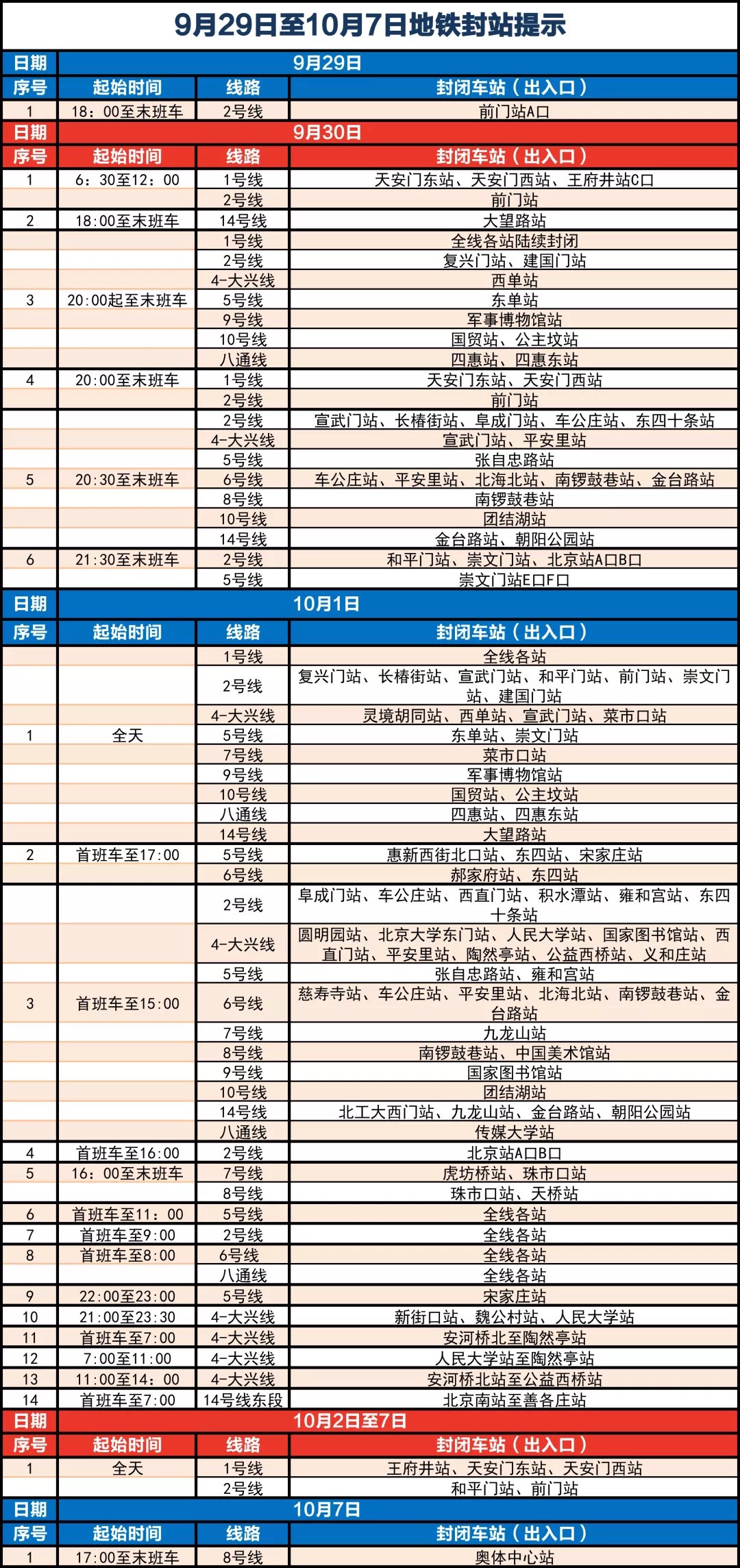 部分地鐵線路車站將在國慶期間做出運營調(diào)整。其中1號當天調(diào)整最為集中,具體調(diào)整如下:1號線全天全線停運。2號線復興門站、建國門站等7座,4號線靈境胡同站、西單站等4座車站,5號線東單站、崇文門站,7號線菜市口站,9號線軍事博物館站,10號線國貿(mào)站、公主墳站等4座車站以及14號線大望路站全天封閉。