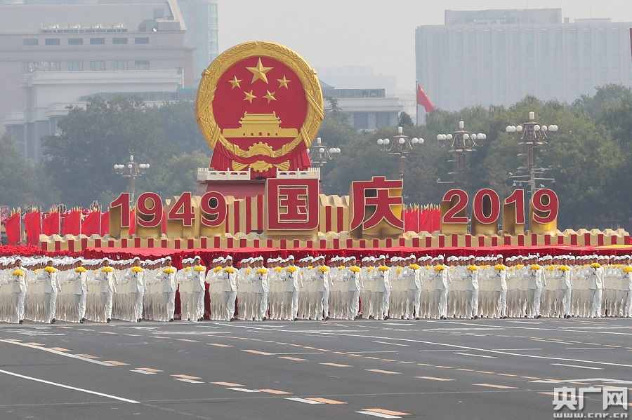 游行分“建國創(chuàng)業(yè)”“改革開放”“偉大復興”三個篇章,10萬群眾、70組彩車組成36個方陣和3個情境式行進。