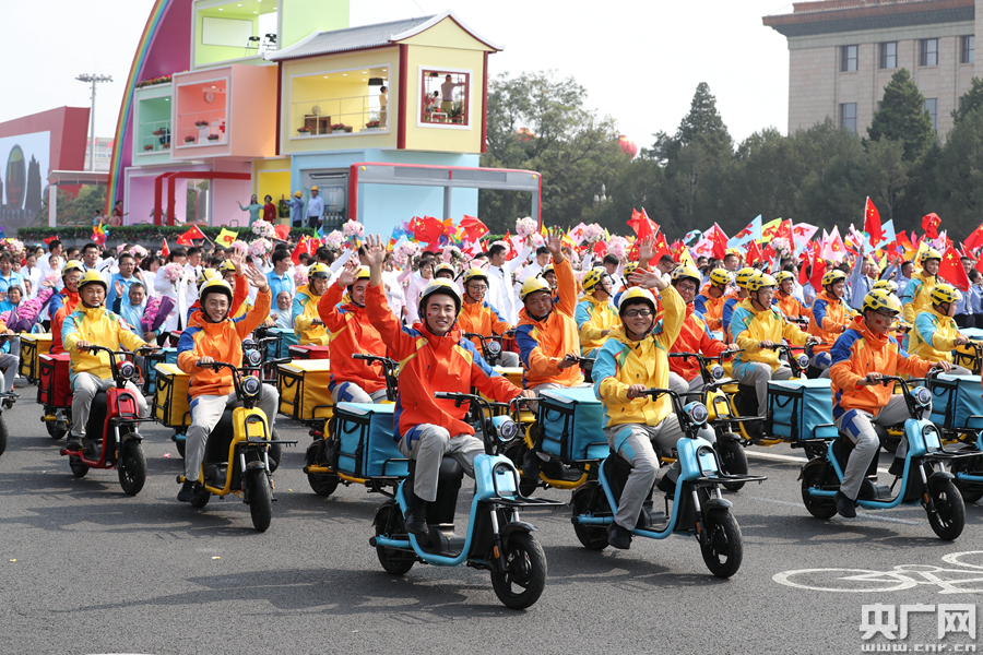 群眾手持紅旗和鮮花高喊“祖國,生日快樂”“我愛你中國”,他們來自祖國各行各業(yè),在游行隊伍中作為新時代、新職業(yè)的代表——“外賣小哥”讓人眼前一亮,他們身著熟悉的工作服,騎車出現(xiàn)在游行隊伍里,綻放出自信和激動的笑容,坐在觀禮臺上的群眾為他們鼓掌、吶喊。